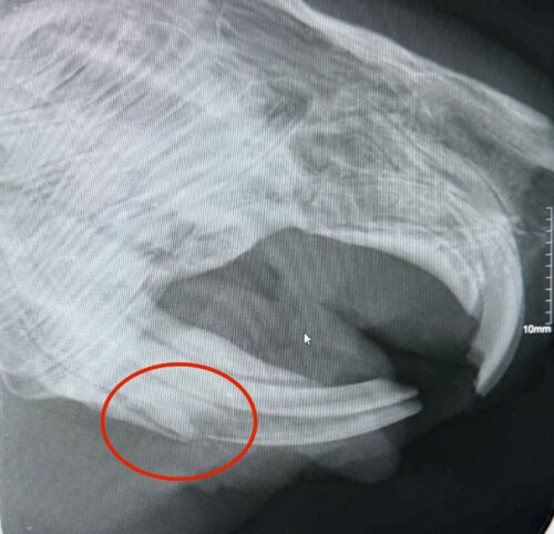 Bei der Untersuchung und dem anschließenden Röntgen zeigte sich, Jumper hatte eine massive Verletzung: Ein Zahnbruch! Einer der unteren Frontzähne waren tief im Kiefer gebrochen 😳