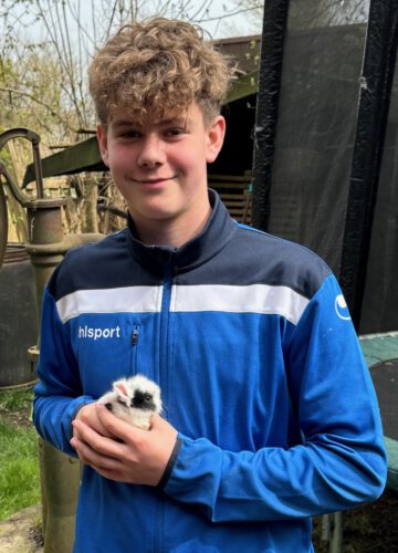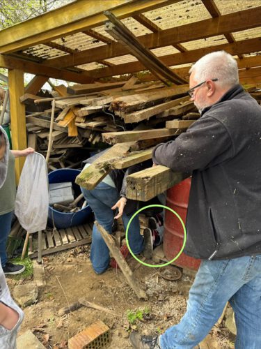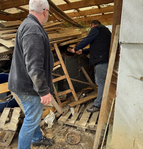Auf dem besagten Grundstück fanden wir dann leider zuerst ein totes Kaninchenbaby. Zwei weitere huschten unter einem riesigen Lager Alt-/Brennholz herum. Wenn diese winzigen Tiere eine Überlebenschance haben sollten, mussten sie da herausgeholt werden. Natürlich verkrochen die Kleinen sich immer tiefer und tiefer. Die Helfer trugen gemeinsam einen Teil des Holzes ab aber immer noch bekamen wir die Kaninchenbabys nicht zu greifen, zeitweise konnten wir sie gar nicht sehen. Ole Haske zwängte sich dann in eine entstandene Lücke um hoffentlich ein Kleines, welches ganz weit hinten unter einer Europalette vermutet wurde, zu sichern und tatsächlich schaffte Ole es!